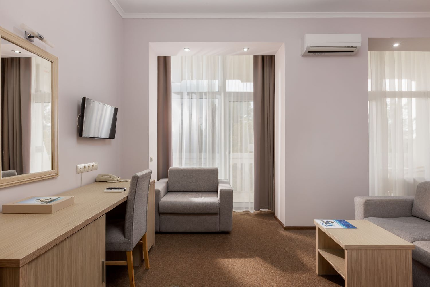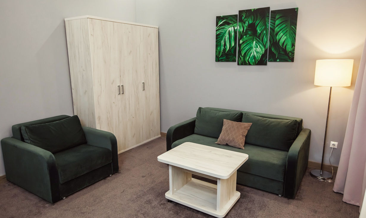 - Полулюксы — просторные номера с улучшенной планировкой, мягкой мебелью и рабочей зоной.